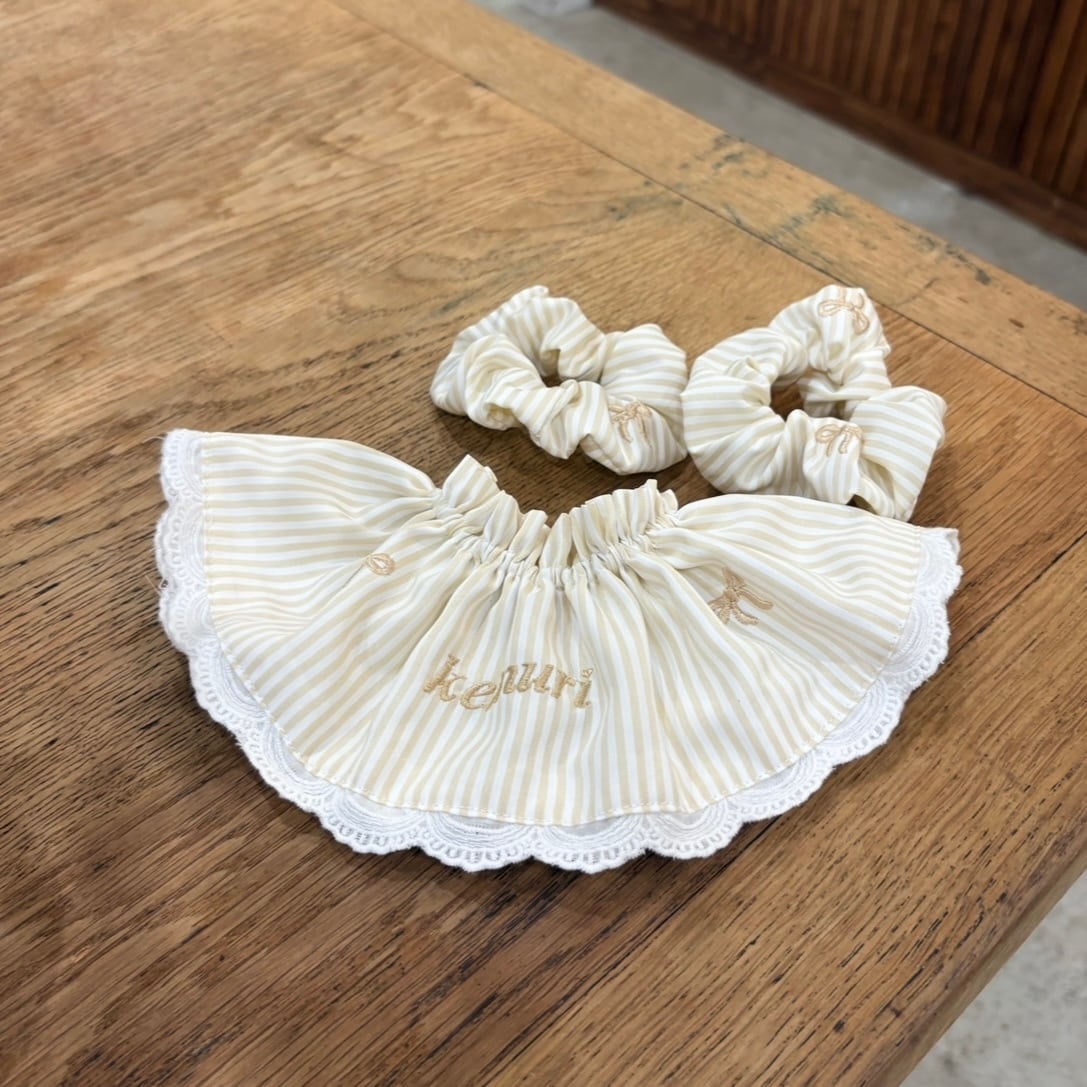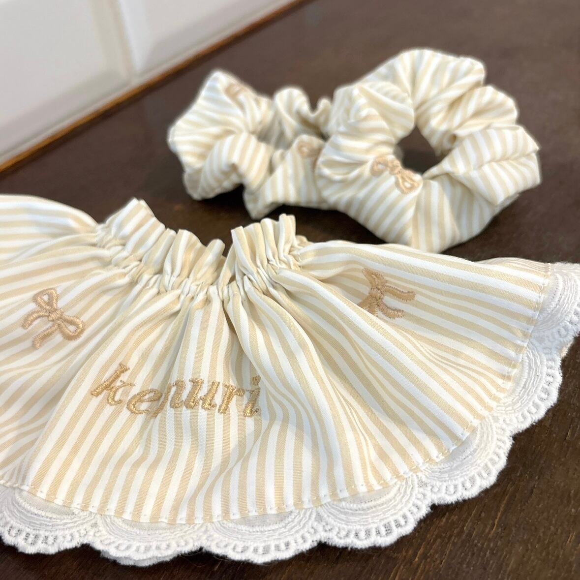 ベージュストライプ×リボン刺繍 ⏦゚